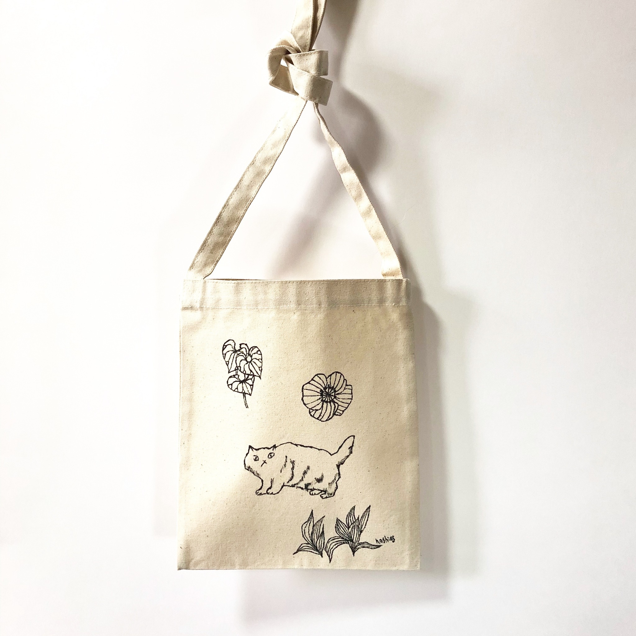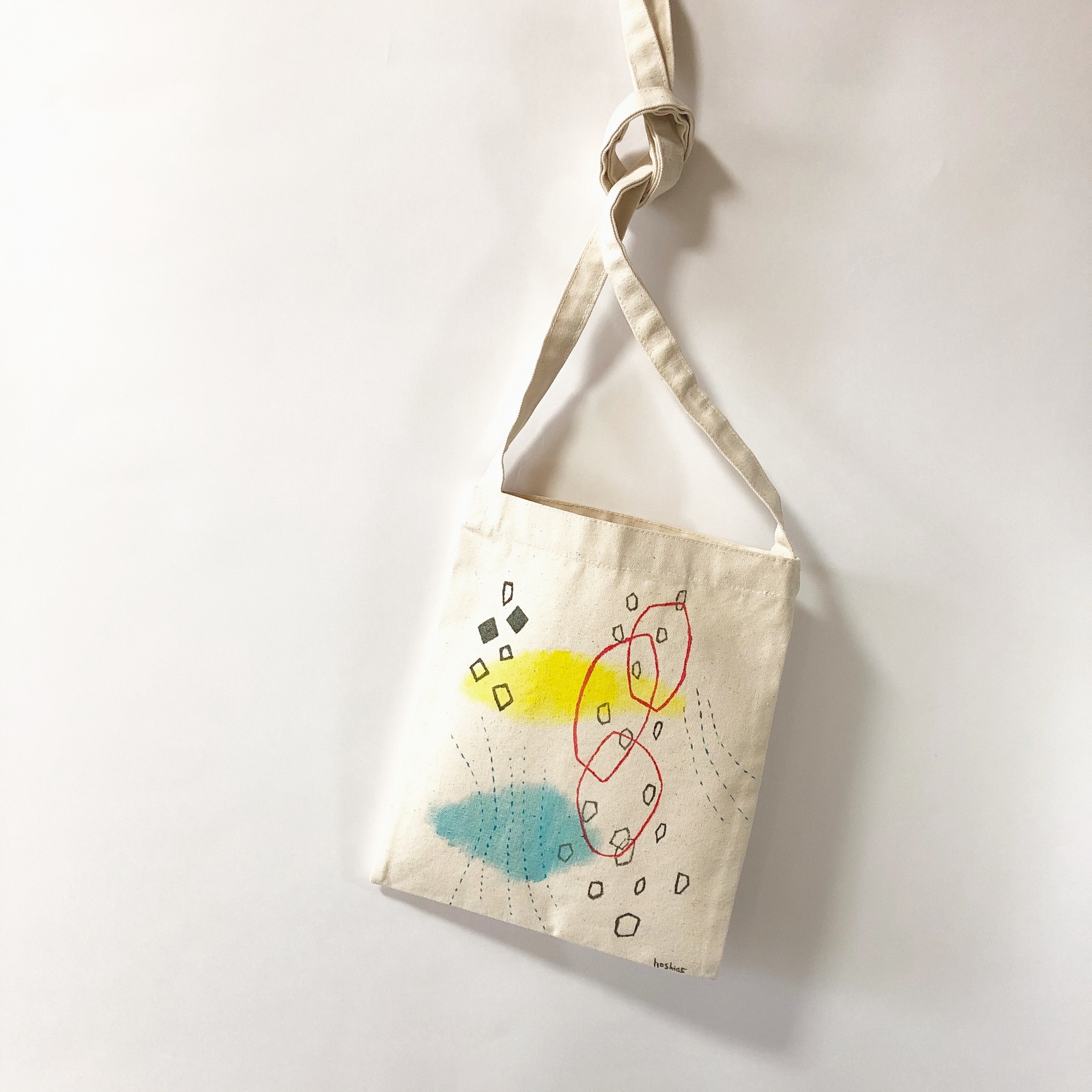 裏生地もないシンプルな形のサコッシュに手描きで描いています。